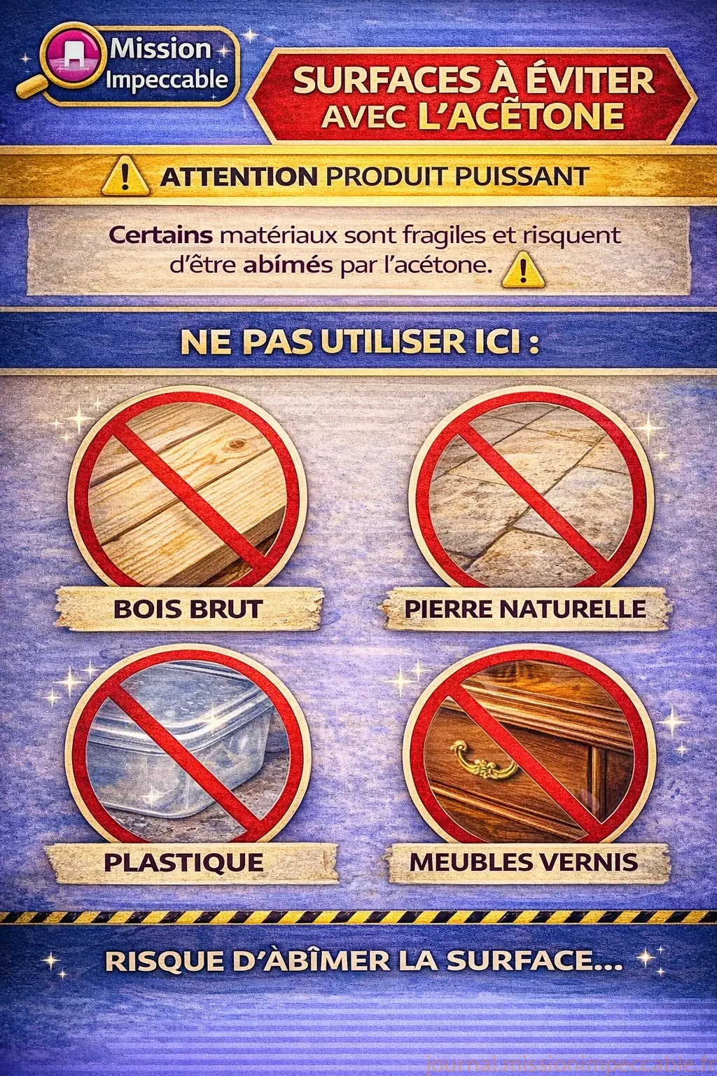 🧹 L’acétone peut faire fondre certains plastiques.